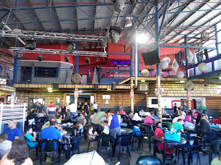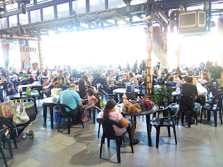 На входе в центральном зале,на воздухе,стоят столы со стульями для желающих перекусить.Там же открыты всевозможные лавки с едой и напитками.